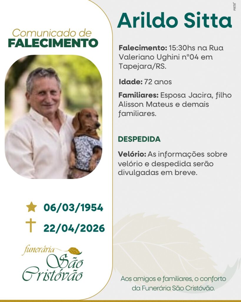 A Funerária São Cristóvão, juntamente com a família Sitta, comunica com pesar, o falecimento de Arildo Sitta, ocorrido às 15h30 do dia 22/04/2026 na Rua Valeriano Ughini, nº 4 em Tapejara com 72 anos de idade. Informações sobre velório e despedida em breve.