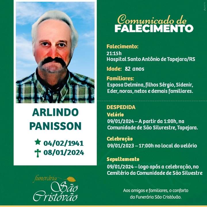A Funerária São Cristóvão, juntamente com a família Panisson, comunica com pesar, o falecimento de Arlindo Panisson, ocorrido às 21h15 do dia 08/01/2024 no HSA com 82 anos de idade. Seu corpo está sendo velado na Comunidade de São Silvestre – Tapejara. Celebração às 17 horas do dia 09/01/2024 e após seu sepultamento no Cemitério da mesma Comunidade.