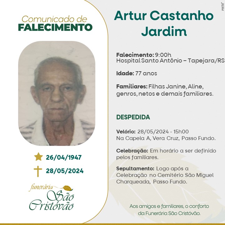 A Funerária São Cristóvão, juntamente com a família Jardim, comunica com pesar, o falecimento de Artur Castanho Jardim, ocorrido às 09 horas do dia 28/05/2024 no HSA de Tapejara com 77 anos de idade. Seu corpo está sendo velado na Capela “A” do Memorial Vera Cruz de Passo Fundo. Celebração com horário a ser definido. O sepultamento ocorrerá no Cemitério São Miguel Charqueada de Passo Fundo.