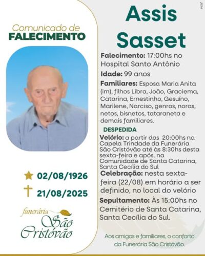 A Funerária São Cristóvão juntamente com a família Sasset, comunica com pesar, o falecimento de Assis Sasset, ocorrido às 17 horas do dia 21/08/2025 no HSA de Tapejara com 99 anos de idade. Seu corpo será velado a partir das 20 horas na Capela Trindade da Funerária São Cristóvão. Celebração no dia 22/08/2025 com horário a ser definido e seu sepultamento às 15 horas no Cemitério da Comunidade de Santa Catarina – Santa Cecília Do Sul.
