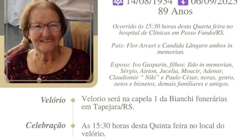 A Bianchi Funerárias, juntamente com a família Gasparin, comunica com pesar, o falecimento de Assunta Maria Gasparin, ocorrido às 15h 30 dia 06/09/2023 no Hospital de Clínicas de Passo Fundo com 89 anos de idade. Seu corpo está sendo velado na Capela I da Bianchi Funerárias. Celebração às 15h 30 do dia 07/09/2023 e após seu sepultamento no Cemitério Municipal João Rombaldi.