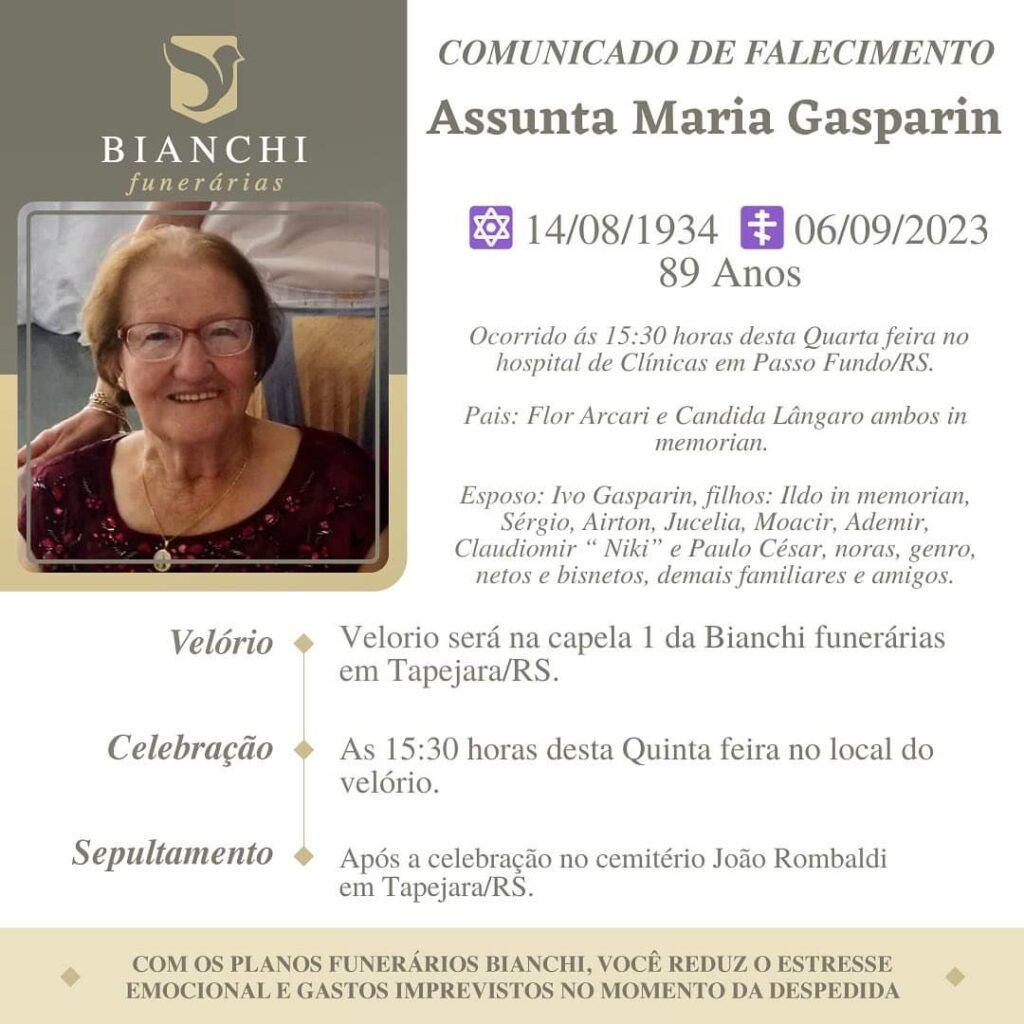 A Bianchi Funerárias, juntamente com a família Gasparin, comunica com pesar, o falecimento de Assunta Maria Gasparin, ocorrido às 15h 30 dia 06/09/2023 no Hospital de Clínicas de Passo Fundo com 89 anos de idade. Seu corpo está sendo velado na Capela I da Bianchi Funerárias. Celebração às 15h 30 do dia 07/09/2023 e após seu sepultamento no Cemitério Municipal João Rombaldi.