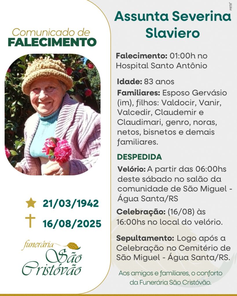 A Funerária São Cristóvão Juntamente com a família Slaviero, comunicam com pesar o falecimento de Assunta Severo Slaviero, ocorrido à 01 hora do dia 16/08/2025 no HSA de Tapejara com 83 anos de idade, seu corpo está sendo velado no Salão da Comunidade de São Miguel Água Santa. Celebração às 16 horas do dia 16/08/2025 e após seu sepultam,ento no Cemitério da mesma localidade.