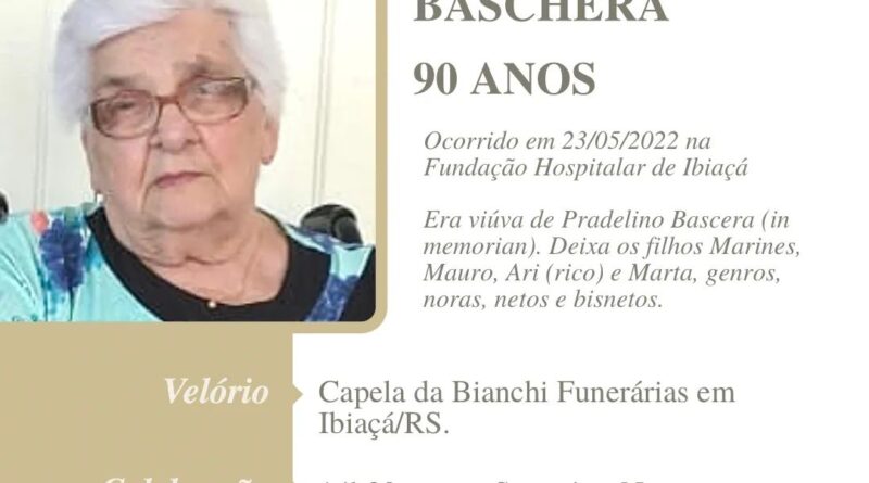A Bianchi Funerárias, juntamente com a família Baschera, comunica com pesar, o falecimento de AURÉLIA TESTOU BASCHERA, com 90 anos de idade, ocorrido em 23/05/2022, na Fundação Hospitalar de Ibiaçá. Seu corpo está sendo velado na capela da Bianchi Funerárias de Ibiaçá. Celebração às 14:30 horas de terça-feira (24/05) no Santuário Nossa Senhora Consoladora de Ibiaçá e logo após seu sepultamento no Cemitério Municipal de Ibiaçá.