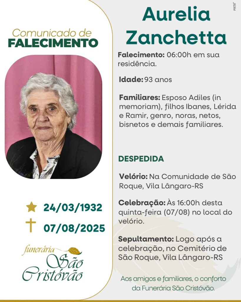 A Funerária São Cristóvão, juntamente com a família Zanchetta, comunica com pesar, o falecimento de Aurélia Zanchetta, ocorrido às 06 horas do dia 07/08/2025 em sua residência com 93 anos de idade. Seu corpo está sendo velado no Salão da Comunidade de São Roque – Vila Lângaro. Celebração às 16 horas do dia 07/08/2025 e após seu sepultamento no Cemitério da mesma localidade.