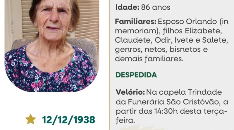 A Funerária São Cristóvão, juntamente com a família Vedana, comunica com pesar, o falecimento de Azelinda Frigeri Vedana, ocorrido às 11 horas do dia 07/10/2025 no Residencial Geriátrico em Tapejara com 86 anos de idade. Seu corpo está sendo velado na Capela Trindade da Funerária São Cristóvão. Celebração às 09 horas do dia 08/10/2025 e após seu sepultamento no Cemitério Municipal João Rombaldi.