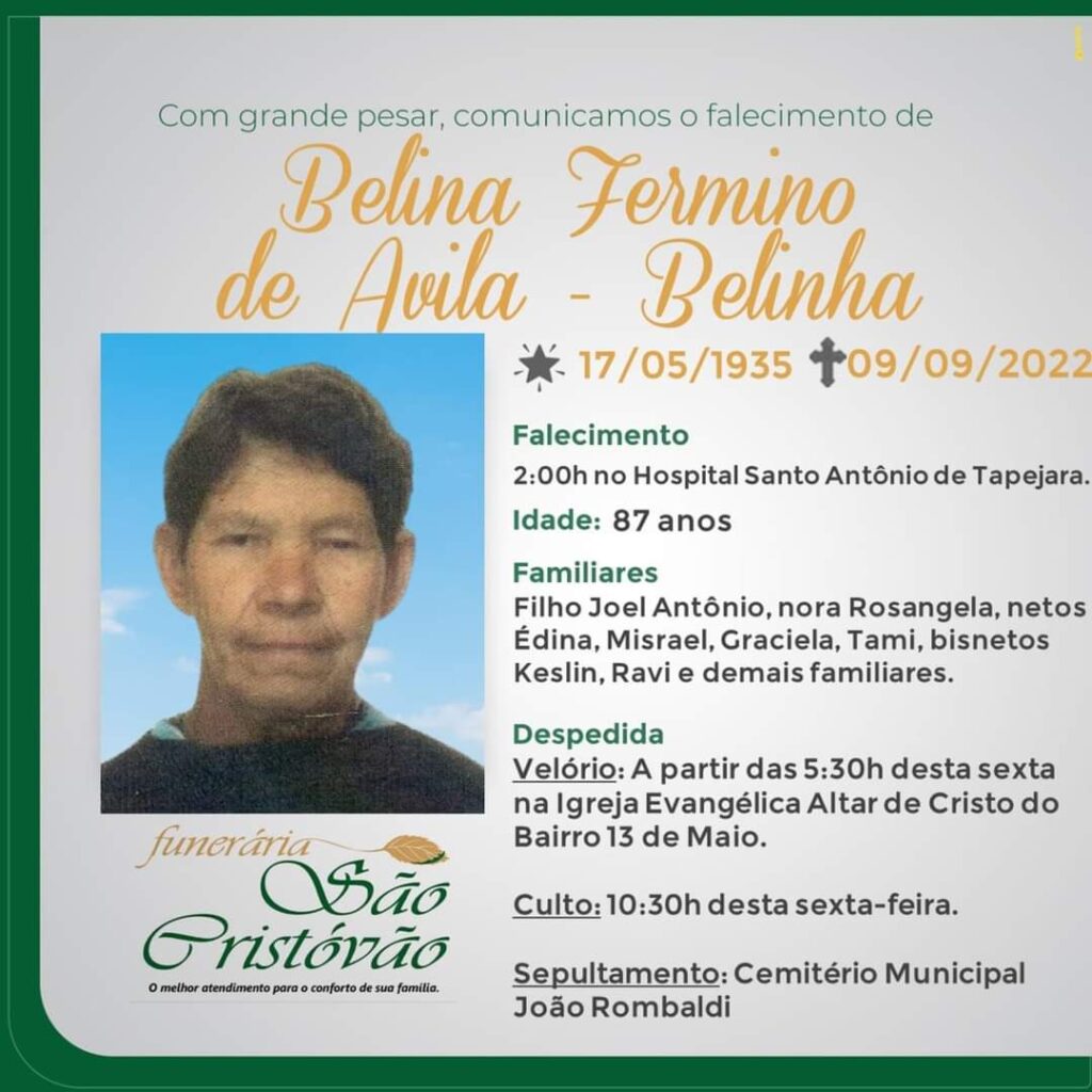 A Funerária São Cristóvão, juntamente com a família de Avila, comunica com pesar, o falecimento da senhora Belina Fermino de Avila, ocorrido às 02:00 horas do dia 09/09 no HSA com 87 anos de idade. Seu corpo está sendo guardado na Igreja Evangélica Altar de Cristo do Bairro 13 de Maio . Culto às 10:30 horas e após seu sepultamento no Cemitério Municipal João Rombaldi.