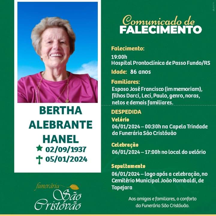 A Funerária São Cristóvão, juntamente com a família Hanel, comunica com pesar, o falecimento de Bertha Alebrante Hanel, ocorrido às 19 horas do dia 05/01/2024 no Hospital Prontoclínica de Passo Fundo com 86 anos de idade. Seu corpo está sendo velado na Capela Trindade da Funerária São Cristóvão. Celebração às 17:00 horas do dia 06/01/2024 e após seu sepultamento no Cemitério Municipal João Rombaldi.