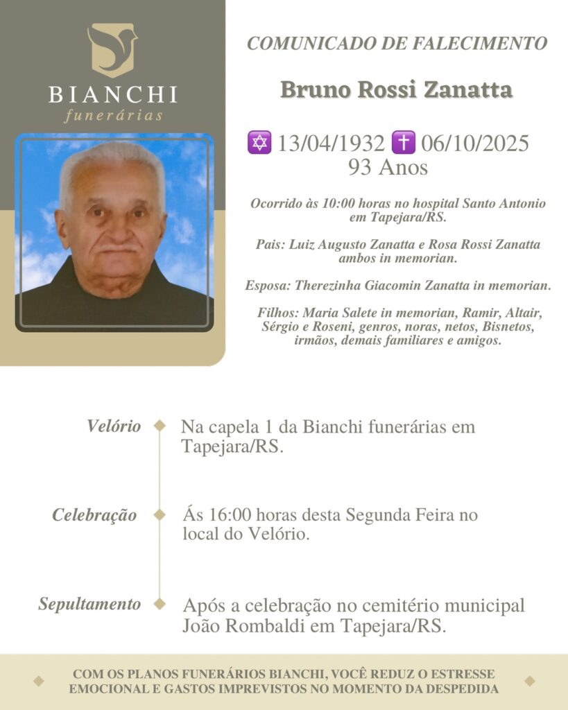 A Bianchi Funerárias, juntamente com a família de Zanatta, comunica com pesar, o falecimento de Bruno Rossi Zanatta, ocorrido às 10 horas do dia 06/10/2025 no HSA de Tapejara com 93 anos de idade. Seu corpo está sendo velado na Capela 1 da Bianchi Funerárias. Celebração às 16 horas do dia 06/10/2025 e após seu sepultamento no Cemitério Municipal João Rombaldi.
