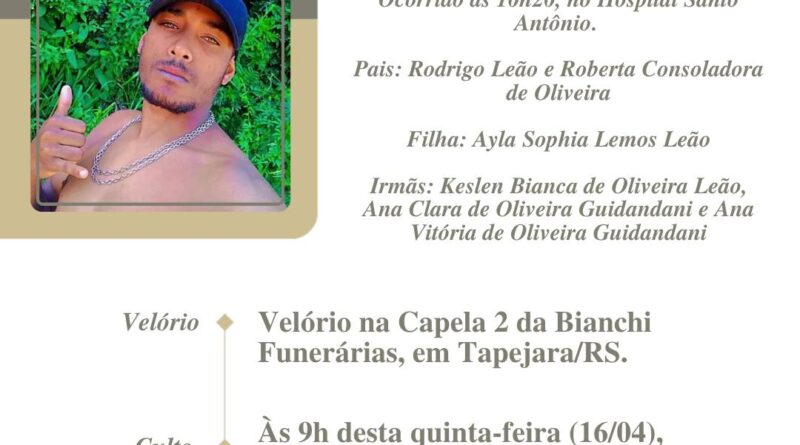 A Bianchi Funerárias juntamente com a família Leão, comunica com pesar, o falecimento de Bryan Junior de Oliveira Leão, ocorrido às 10h20 do dia 15/04/2026 no HSA de Tapejara com 21 anos de idade. Seu corpo está sendo guardado na Capela 2 da Bianchi Funerárias. Culto às 09 horas do dia 16/04/2026 no local do velório e após seu sepultamento no Cemitério Municipal de Água Santa – RS.