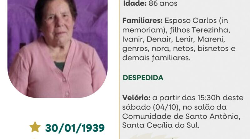 A Funerária São Cristóvão, juntamente com a família Viana, comunica com pesar, o falecimento de Candida Caroff Viana, ocorrido às 11 horas do dia 04/10/2025 no HSA de Tapejara com 86 anos de idade. Seu corpo está sendo velado no Salão da Comunidade de Santo Antônio – Santa Cecília do Sul. Celebração às 10h30do dia 05/10/2025 e após seu sepultamento no Cemitério da mesma Comunidade.