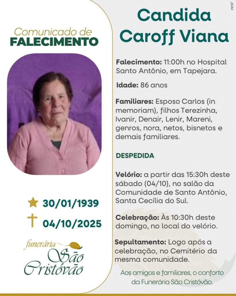 A Funerária São Cristóvão, juntamente com a família Viana, comunica com pesar, o falecimento de Candida Caroff Viana, ocorrido às 11 horas do dia 04/10/2025 no HSA de Tapejara com 86 anos de idade. Seu corpo está sendo velado no Salão da Comunidade de Santo Antônio – Santa Cecília do Sul. Celebração às 10h30do dia 05/10/2025 e após seu sepultamento no Cemitério da mesma Comunidade.