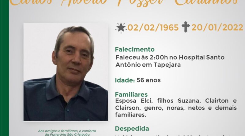 A Funerária São Cristóvão, juntamente com a família Pozzer, comunicab com pesar, o falecimento do senhor Carlos Alberto Pozzer (Carlinhos), ocorrido as 02:00 horas da madrugada do dia 20 de janeiro, no HSA com 56 anos de idade. Seu corpo está sendo velado na Capela Trindade da Funerária São Cristóvão, onde as 16:00 horas haverá celebração e logo após seu sepultamento no Cemitério Municipal João Rombaldi.
