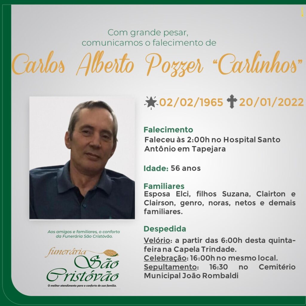 A Funerária São Cristóvão, juntamente com a família Pozzer, comunicab com pesar, o falecimento do senhor Carlos Alberto Pozzer (Carlinhos), ocorrido as 02:00 horas da madrugada do dia 20 de janeiro, no HSA com 56 anos de idade. Seu corpo está sendo velado na Capela Trindade da Funerária São Cristóvão, onde as 16:00 horas haverá celebração e logo após seu sepultamento no Cemitério Municipal João Rombaldi.