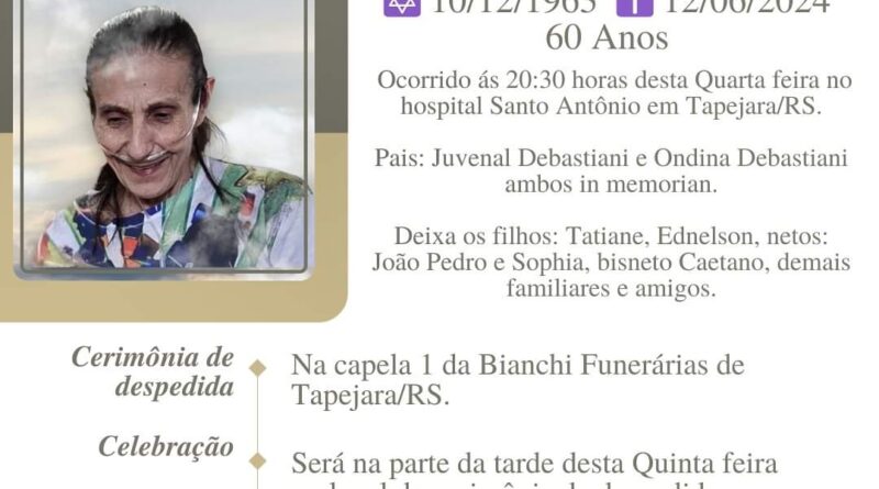 A Bianchi Funerárias, juntamente com a família Debastiani, comunica com pesar, o falecimento de Carmelinda Debastiani, ocorrido às 20h30 do dia 12/06/2024 no HSA de Tapejara com 60 anos de idade. Seu corpo está sendo velado na Capela I da Bianchi Funerárias. Celebração e sepultamento na tarde de 13/06/2024 com horário a ser definido.