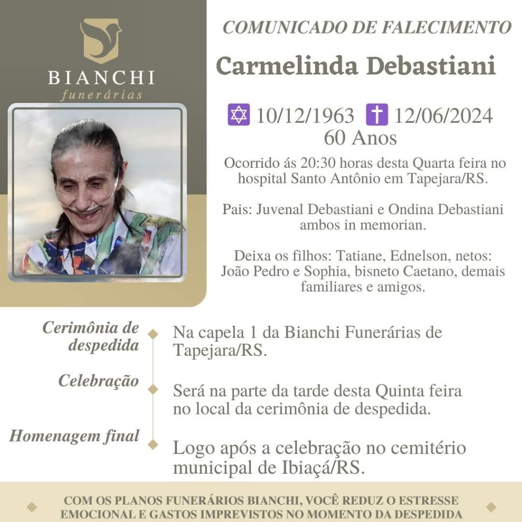 A Bianchi Funerárias, juntamente com a família Debastiani, comunica com pesar, o falecimento de Carmelinda Debastiani, ocorrido às 20h30 do dia 12/06/2024 no HSA de Tapejara com 60 anos de idade. Seu corpo está sendo velado na Capela I da Bianchi Funerárias. Celebração e sepultamento na tarde de 13/06/2024 com horário a ser definido.