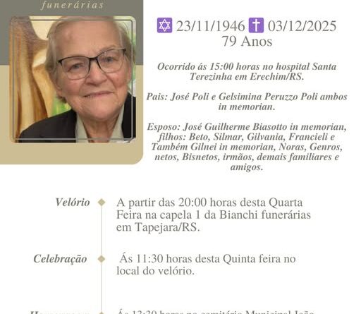 A Bianchi Funeráriasi, juntamente com a família Biasotto, comunica com pesar, o falecimento de Carmen Irene Biasotto, ocorrido às 15 horas do dia 03/12/2025 no Hospital Santa Terezinha de Erechim com 79 anos de idade. Seu corpo está sendo velado na Capela 1 da Bianchi Funerárias. Celebração às 11h30 do dia 04/12/2025 e sepultamento às 13h30 no Cemitério Municipal João Rombaldi.