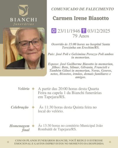 A Bianchi Funeráriasi, juntamente com a família Biasotto, comunica com pesar, o falecimento de Carmen Irene Biasotto, ocorrido às 15 horas do dia 03/12/2025 no Hospital Santa Terezinha de Erechim com 79 anos de idade. Seu corpo está sendo velado na Capela 1 da Bianchi Funerárias. Celebração às 11h30 do dia 04/12/2025 e sepultamento às 13h30 no Cemitério Municipal João Rombaldi.