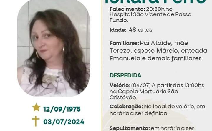 A Funerária São Cristóvão, juntamente com a família Ferro, comunica com pesar, o falecimento de Cátia Ionara Ferro, ocorrido às 20h30 do dia 03/07/2024 no Hospital São Vicente de Paulo de Passo Fundo com 48 anos de idade. Seu corpo será velado a partir das 13 horas do dia 04/07/2024 na Capela da Funerária São Cristóvão. Celebração às 17 horas do dia 04/07/2024 e após seu sepultamento no Cemitério Municipal João Rombaldi.