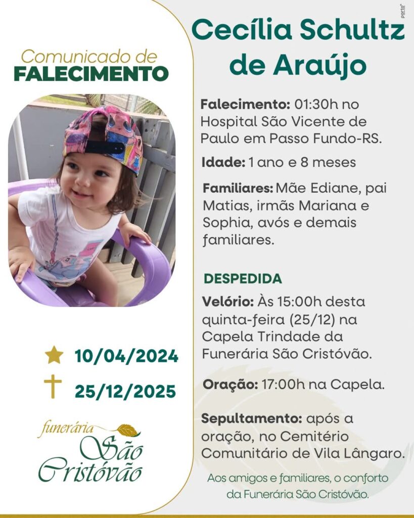 A Funerária São Cristóvão, juntamente com a família de Araújo, comunica com pesar, o falecimento de Cecilia Schultz de Araújo, ocorrido à 01h30 do dia 25/12/2025, no Hospital São Vicente de Paulo de Passo Fundo com 1 ano e 8 meses de idade. Seu corpo será velado a partir das 15 horas desta quinta-feira na Capela Trindade da Funerária São Cristóvão. Oração às 17 horas no local do velório e após seu sepultamento no Cenitério Municipal de Vila Lângaro.