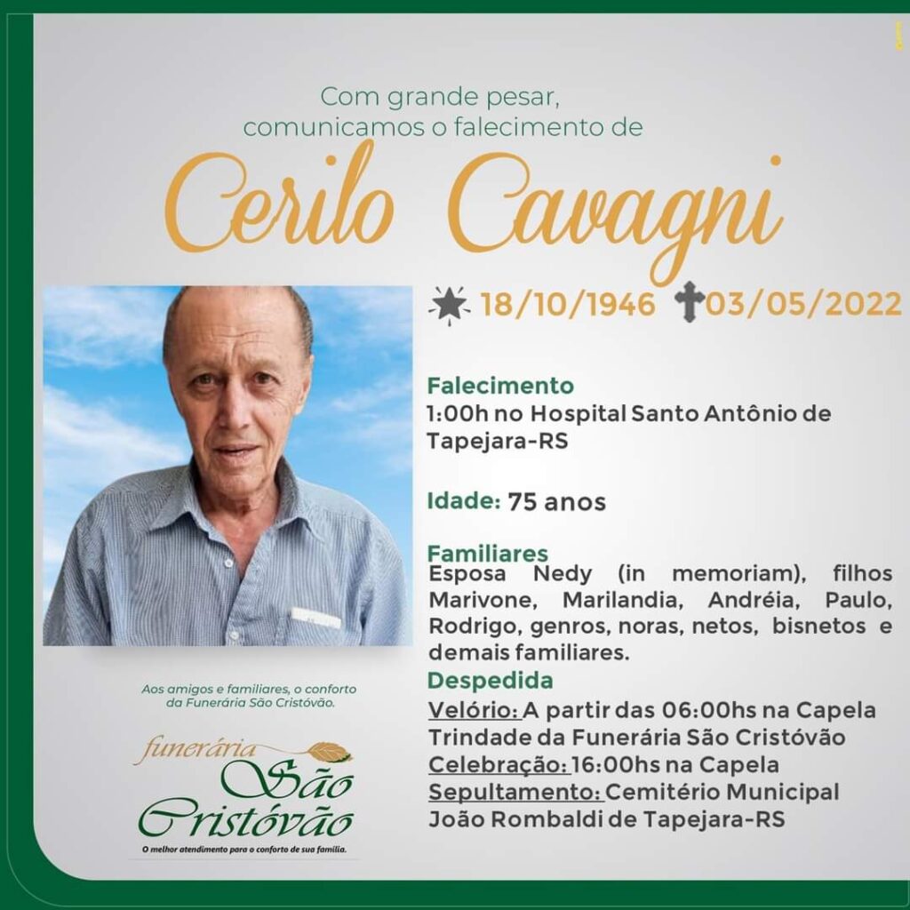 A Funurária São Crist9vão, juntamente com a família Cavagni, comunica com pesar, o falecimento do senhor Cerilo Cavagni, ocorrido a 01:00 hora de terça-feira (03/05) no HSA com 75 anos de idade. Seu corpo está sendo velado na Capela Trindade da Funerária São Cristóvão. Celebração às 16:00 horas desta terça-feira e após seu sepultamento no Cemitério Municipal João Rombaldi.