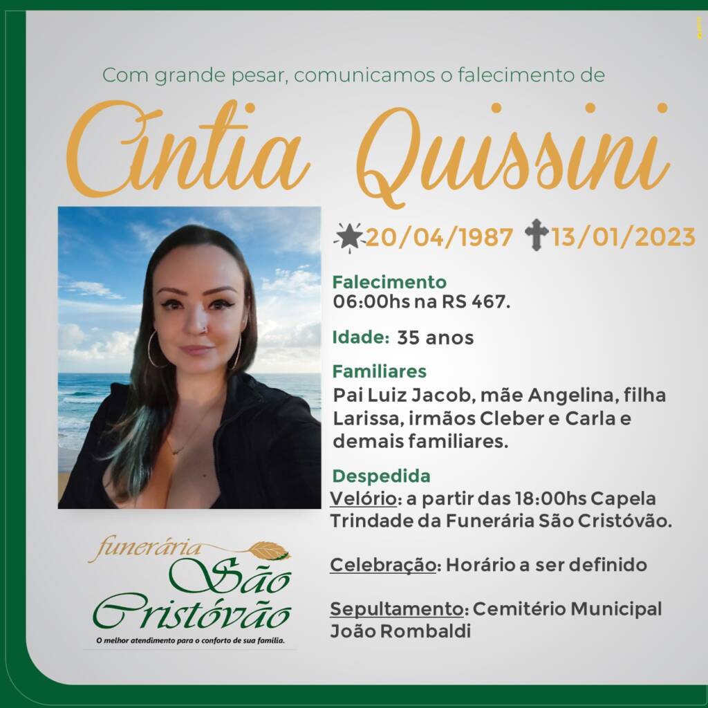 A Funerária São Cristóvão, juntamente com a família Quissini, comunica com pesar, o falecimento de Cíntia Quissini, ocorrido às 06:00 horas do dia 13/01/2023 na ERS-467 em Tapejara com 35 anos de idade. Seu corpo será sendo velado, a partir das 18:00 horas do dia 13/01/2023, na Capela Trindade da Funerária São Cristóvão. Celebração e sepultamento com horário a ser definido.