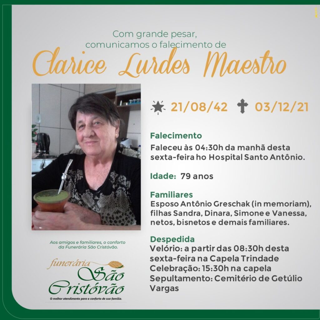 A FunerárA Funerária São Cristóvão, juntamente com a família Maestro, comunica com pesar, o falecimento da senhora Clarice Lurdes Maestro, com 79 anos de idade, ocorrido as 04:30 horas desta sexta-feira (03/12) no Hospital Santo Antônio de Tapejara. O velório acontece na Capela Trindade da Funerária São Cristóvão. As 15:30 horas celebração a Capela e após seu sepultamento no Cemitério de Getúlio Vargas.