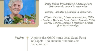 Missa ás 09:00 horas de sábado (27/11) no local do velório e logo após seu sepultamento no cemitério municipal de Charrua cidade Alta