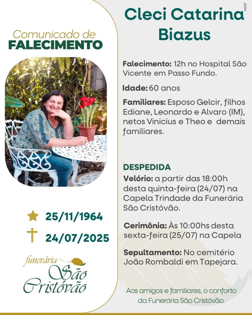 A Funerária São Cristóvão, juntamente com a família Biazus, comunica com pesar, o falecimento de Cleci Catarina Biazus, ocorrido às 12 horas do dia 24/07/2025 no Hospital São Vicente de Paulo de Passo Fundo com 60 anos de idade. Seu corpo será velado a partir das 18 horas na Capela Trindade da Funerária São Cristóvão. Celebração às 10 horas do dia 25/07/2025 e após seu sepultamento no Cemitério Municipal João Rombaldi de Tapejara.