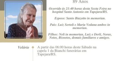 A Funerária São Cristóvão, juntamente com a família Favareto, comunica com pesar, o falecimento de Clemir Favaretoa, ocorrido às 23 horas do dia 06/12/2025 no Hospital São Vicente de Paulo de Passo Fundo com 53 anos de idade. Seu corpo está sendo velado no Salão da Comunidade do Gramado do Erval – Água Santa. Celebração às 16h30 do dia 07/12/2025 e após seu sepultamento no Cemitério Municipal de Água Santa.