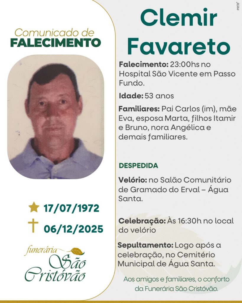 A Funerária São Cristóvão, juntamente com a família Favareto, comunica com pesar, o falecimento de Clemir Favaretoa, ocorrido às 23 horas do dia 06/12/2025 no Hospital São Vicente de Paulo de Passo Fundo com 53 anos de idade. Seu corpo está sendo velado no Salão da Comunidade do Gramado do Erval – Água Santa. Celebração às 16h30 do dia 07/12/2025 e após seu sepultamento no Cemitério Municipal de Água Santa.