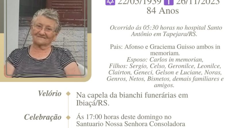 A Bianchi Funerárias, juntamente com a família Bonatto, comunica com pesar, o falecimento de Cremilda Emília Guisso Bonatto, ocorrido às 05h30 do dia 26/11/2023 no HSA de Tapejara com 84 anos de idade. Seu corpo está sendo velado na Capela da Bianchi Funerárias de Ibiaçá. Celebração às 17 horas deste domingo dia 26/11/2023 no Santuário Nossa Senhora Consoladora e após seu sepultamento no Cemitério Municipal de Ibiaçá.