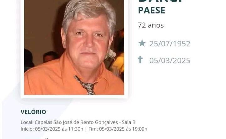 O Grupo L. Formolo, juntamente com a família Paese, comunica com pesar, o falecimento de Darci Paese, ocorrido dia 05/03/2025 em Bento Gonçalves com 72 anos de idade. Seu corpo está sendo velado na Capela São José de Bento Gonçalves até as 19 horas do dia 05/03/2025, onde acontecerá cerimônia de despedida e após seu corpo será cremado no Memorial Crematório São José.