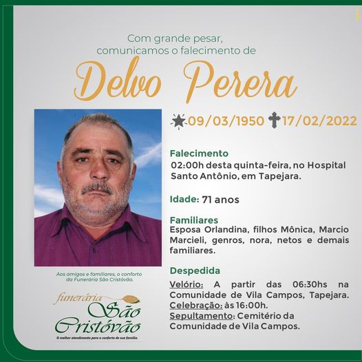 A Funerária São Cristóvão, juntamente com a família Perera, comunica com pesar, o falecimento do senhor Delvo Perera, ocorrido às 02:00 horas desta quinta-feira (170/2) no Hospital Santo Antônio de Tapejara, com 71 anos de idade. Seu corpo está sendo velado na comunidade de Vila Campos. Celebração às 16:00 horas e após seu sepultamento no Cemitério da mesma comunidade.