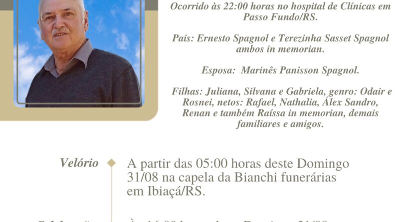 A Bianchi Funerárias, juntamente com a família Spagnol, comunica com pesar, o falecimento de Delvo Spagnol, ocorrido às horas do dia 30/08/2025 no Hospital de Clínicas de Paulo de Passo Fundo com 72 anos de idade. Seu corpo está sendo velado na Capela da Bianchi Funerárias de Ibiaçá. Celebração às 16 horas do dia 31/08/2025 e após seu sepultamento no Cemitério da Comunidade de Santo Antônio – Santa Cecília do Sul.