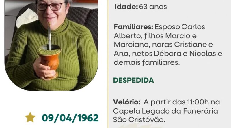 A Funerária São Cristóvão, juntamente com a família da Silveira, comunica com pesar, o falecimento de Denise Vieira Da Silveira, ocorrido às 07 horas do dia 20/02/2026 no HSA de Tapejara, com 63 anos de idade. Seu corpo está sendo velado na Capela Legado da Funerária São Cristóvão. Culto às 17h30 do dia 20/02/2026 e após seu sepultamento no Cemitério Municipal João Rombaldi de Tapejara.
