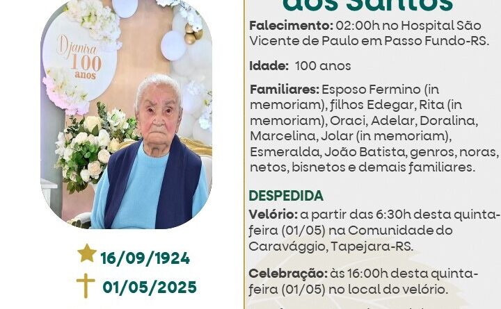 A Funerária São Cristóvão, juntamente com a família dos Santos, comunica com pesar, o falecimento de Djanira Rodrigues dos Santos, ocorrido às 02 horas do dia 01/05/2025 no Hospital São Vicente de Paulo de Passo Fundo com 100 anos de idade. Seu corpo está sendo velado na Comunidade do Caravágio – Tapejara. Celebração às 16 horas do dia 01/05/2025 no local do velório e após seu sepultamento no Cemitério da mesma localidade.