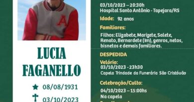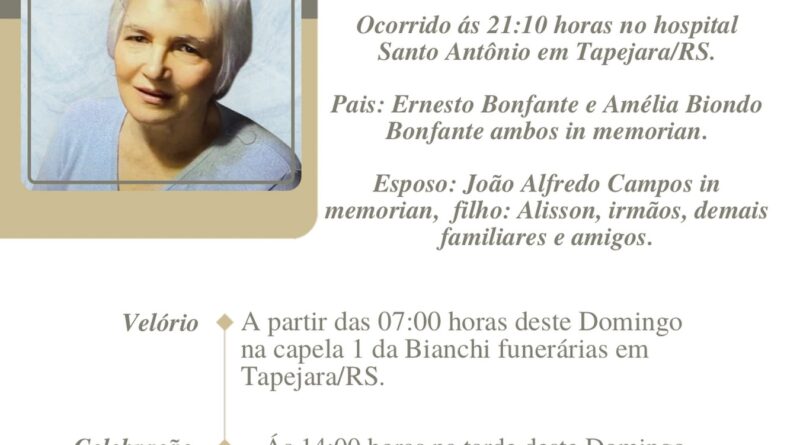 A Bianchi Funerárias, juntamente com a família Campos, comunica com pesar, o falecimento de Doraci Maria Bonfante Campos, ocorrido às 21h30 do dia 22/11/2025 no HSA de Tapejara com 75 anos de idade. Seu corpo está sendo velado na Capela 1 da Bianchi Funerárias. Celebração às 14 horas do dia 23/11/2025 no local do velório e após seu corpo será transladado para o Memorial Vera Cruz onde será cremada.
