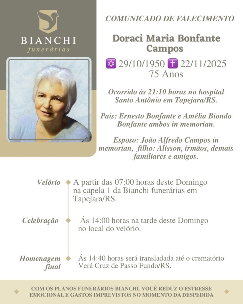 A Bianchi Funerárias, juntamente com a família Campos, comunica com pesar, o falecimento de Doraci Maria Bonfante Campos, ocorrido às 21h30 do dia 22/11/2025 no HSA de Tapejara com 75 anos de idade. Seu corpo está sendo velado na Capela 1 da Bianchi Funerárias. Celebração às 14 horas do dia 23/11/2025 no local do velório e após seu corpo será transladado para o Memorial Vera Cruz onde será cremada.