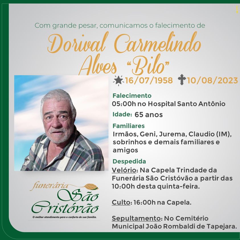 A Funerária São Cristóvão, juntamente com a família Alves, comunica com pesar, o falecimento de Dorival Carmelindo Alves – “Bilo”, ocorrido às 05 horas do dia 10/08/2023 no HSA com 65 anos de idade. Seu corpo está sendo velado na Capela Trindade da Funerária São Cristóvão. Celebração às 16 horas do dia 10 e após seu sepultamento no Cemitério Municipal João Rombaldi.