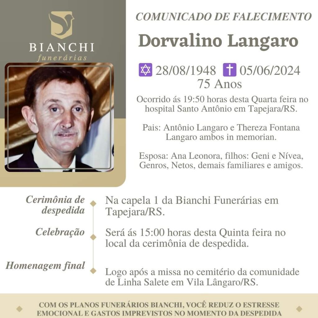 A Bianchi Funerárias, juntamente com a família Lângaro, comunica com pesar, o falecimento de Dorvalino Lângaroi, ocorrido às 19h50 do dia 05/06/2024 no HSA de Tapejara com 75 anos de idade. Seu Corpo está sendo velado na Capela 1 da Bianchi Funerárias. Celebração às 15 horas do dia 06/06/2024 e após seu sepultamento no Cemitério Linha Costela – Vila Lângaro.