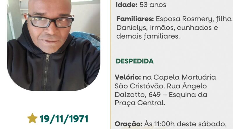 A Funerária São Cristóvão, juntamente com a família Gil, comunica com pesar, o falecimento de Einar Antonio Presilla Gil, ocorrido às 18h30 do dia 07/11/2025 no Hospital Santa Terezinha em Erechim com 53 anos de idade. Seu corpo está sendo velado na Capela Mortuária Funerária São Cristóvão. Oração às 11 horas do dia 08/11/2025 e após seu sepultamento cemitério Municipal João Rombaldi.