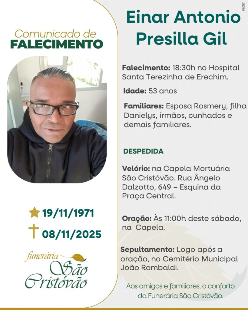 A Funerária São Cristóvão, juntamente com a família Gil, comunica com pesar, o falecimento de Einar Antonio Presilla Gil, ocorrido às 18h30 do dia 07/11/2025 no Hospital Santa Terezinha em Erechim com 53 anos de idade. Seu corpo está sendo velado na Capela Mortuária Funerária São Cristóvão. Oração às 11 horas do dia 08/11/2025 e após seu sepultamento cemitério Municipal João Rombaldi.