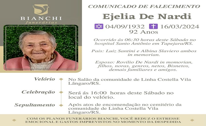 A Bianchi Funerárias, juntamente do a família de Nardi, comunica com pesar, o falecimento de Ejelia de Nardi, ocorrido às 06h30 do dia 16/03/2024 no HSA de Tapejara com 92 anos de idade. Seu corpo está sendo velado no Salão da Comunidade de Linha Costela – Vila Lângaro. Celebração às 16 horas do dia 16/03/2024 e após seu sepultamento no Cemitério da mesma localidade.