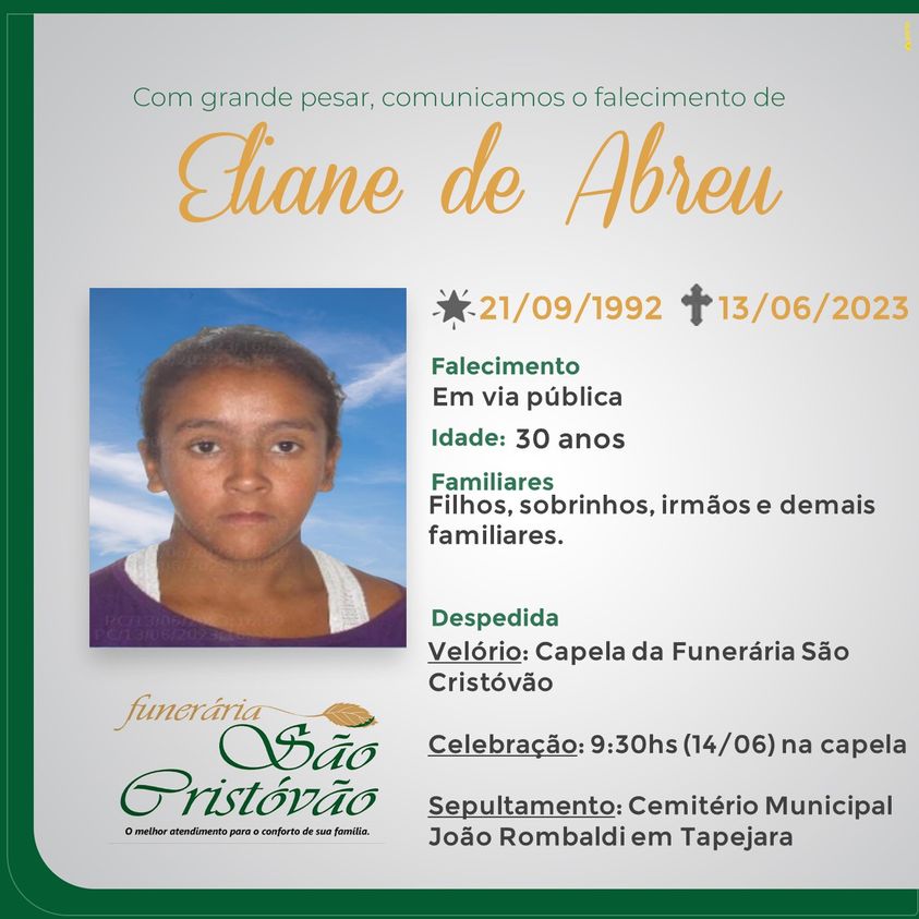 A Funerária São Cristóvão, juntamente com a família de Abreu, comunica o falecimento de Eliane de Abreu, ocorrido dia 13/06/2023 em via pública em Tapejara com 30 anos de idade. Seu corpo está sendo velado na Capela da Funerária São Cristóvão. Celebração às 09h30 min do dia 14/06/2023 e após seu sepultamento no Cemitério Municipal João Rombaldi.