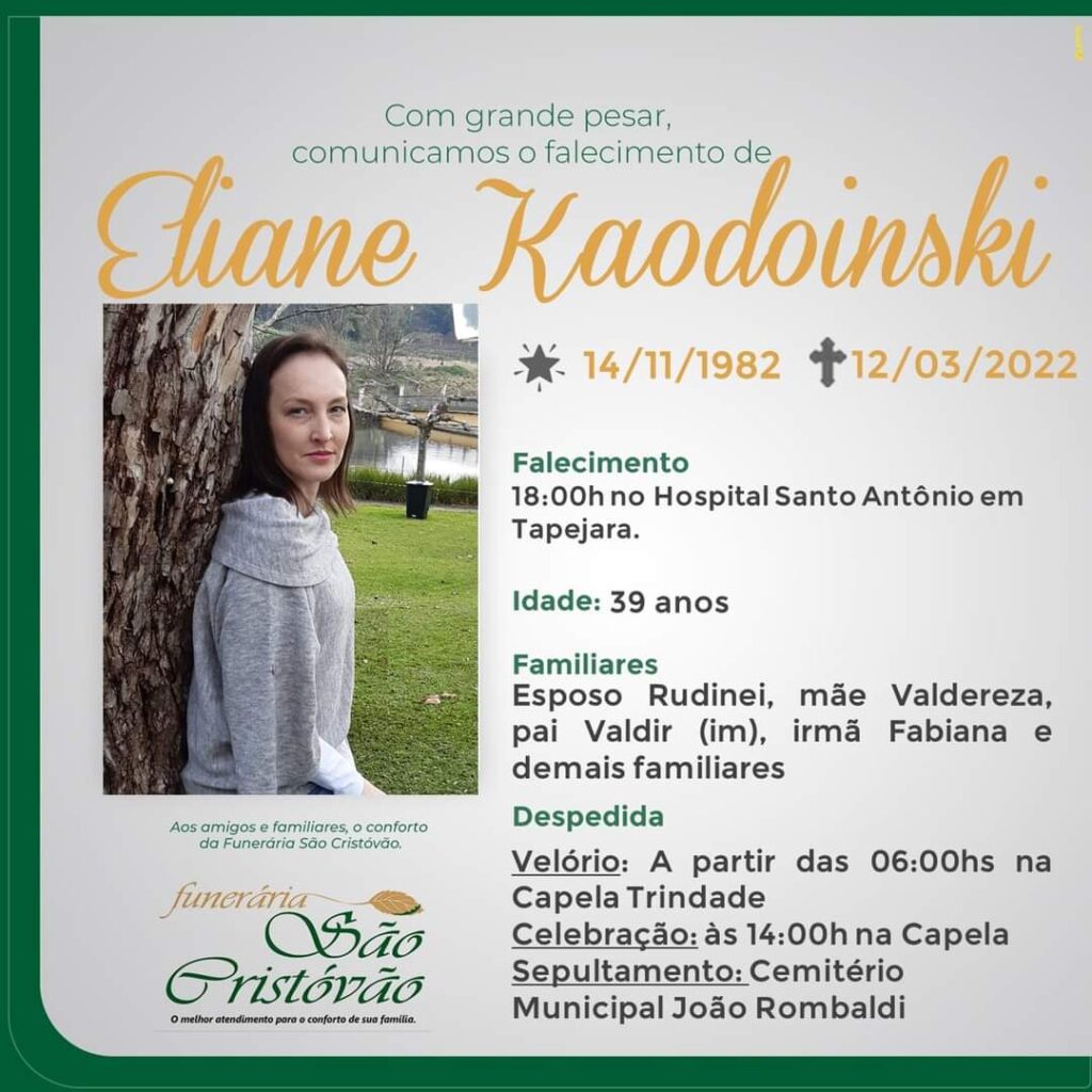 A Funerária São Cristóvão, juntamente com a família Kaodoinske, comunica com pesar, o falecimento de Eliane Kaodoinske, ocorrido às 18:00 horas de sábado (12/03), no HSA com 39 anos de idade. Seu corpo está sendo velado na capela Trindade da Funerária São Cristóvão. Celebração às 14:00 horas de domingo (13/03) e após seu sepultamento no Cemitério Municipal João Rombaldi.