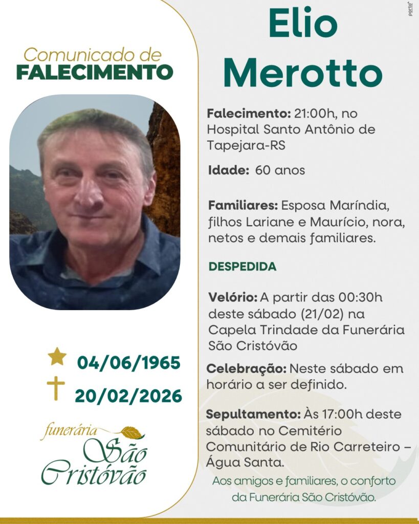 A Funerária São Cristóvão, juntamente com a família da Merotto, comunica com pesar, o falecimento de Elio Merotto, ocorrido às 21 horas do dia 20/02/2026 no HSA de Tapejara, com 60 anos de idade. Seu corpo está sendo velado na Capela Trindade da Funerária São Cristóvão. Celebração sábado, 21/02/2026, com horário a ser definido e sepultamento às 17 horas no Cemitério da Comunidade de Rio Carreteiro – Água Santa.
