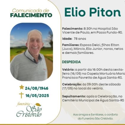 A Funerária São Cristóvão, juntamente com a família Piton, comunica com pesar, o falecimento de Elio Piton, ocorrido às 08h30 do dia 16/05/2025 no Hospital São Vicente de Paulo de Passo Fundo com 78 anos de idade. Seu corpo está sendo velado na Capela Mortuária de Água Santa. Celebração às 09 horas do dia 17/05/2025 e após seu sepultamento no Cemitério Municipal de Água Santa.