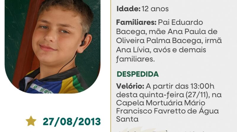 A Funerária São Cristóvão, juntamente com a família Bacega, comunica com pesar, o falecimento de Ellian Bacega, ocorrido às 20 horas do dia 26/11/2025 no Hospital de Clínicas de Passo Fundo com 12 anos de idade. Seu corpo será levado a partir das 13 horas do dia 27/11/2025 na Capela Mortuária de Água Santa. Celebração às 17h30 do dia 27/11/2025 no local do velório e após seu sepultamento no Cemitério Municipal de Água Santa.