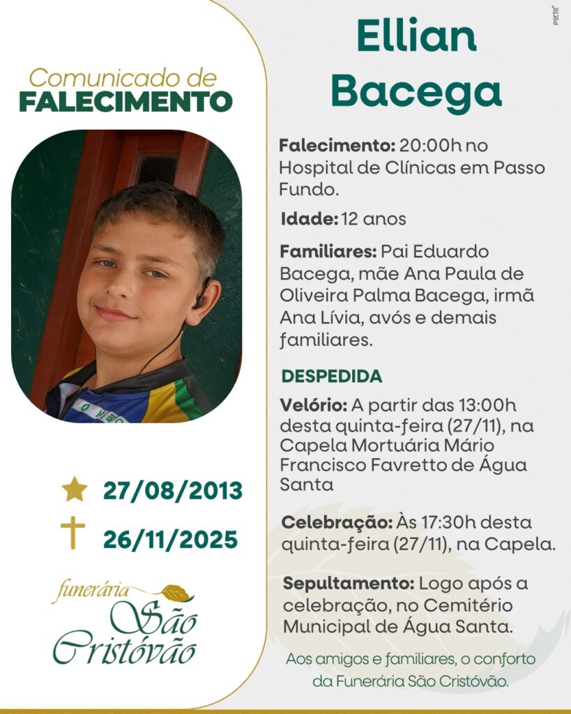 A Funerária São Cristóvão, juntamente com a família Bacega, comunica com pesar, o falecimento de Ellian Bacega, ocorrido às 20 horas do dia 26/11/2025 no Hospital de Clínicas de Passo Fundo com 12 anos de idade. Seu corpo será levado a partir das 13 horas do dia 27/11/2025 na Capela Mortuária de Água Santa. Celebração às 17h30 do dia 27/11/2025 no local do velório e após seu sepultamento no Cemitério Municipal de Água Santa.